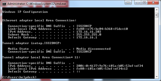 Here is an example of what your command prompt window will look like in most Windows Operating Systems. The Operating System that I am using is Windows 7 just for your information. As you see in the example, Type ipconfig to view all of your IP information. From this menu you will be able to see your IPv4 address, IPv6 address, Subnet Mask, and Gateway. This information is useful in trying to troubleshoot network problems. Let’s see another screen shot with my IP information.